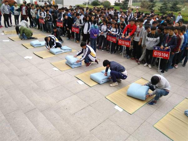 新生班级推选2至3名代表参赛,在6分钟内独立操作完成,伴随着主持人宣布“开始”,叠被子比赛在紧张激烈的气氛中拉开帷幕。只见选手们迅速将被子压平、对折、切槽、起角……按照平日里教官教的方法一步步熟练地整理着被子。他们娴熟的动作,熟练的操作技巧赢得了同学们的阵阵掌声,整个赛场紧张热烈、热火朝天。比赛结束,赛场上呈现出一个个整整齐齐、有棱有角、方方正正的“豆腐块”。经过认真、细致的评比,15104班刘越同学取得第一名。