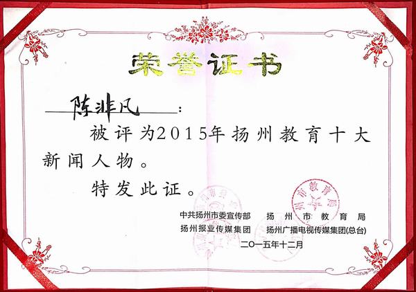 12月29日下午,由市委宣传部、市教育局、扬州报业传媒集团、扬州广电传媒集团(总台)等联合举办的2015年扬州教育十大新闻人物颁奖典礼在扬州中学举行。市政协副主席王克胜出席并颁奖。我校陈非凡同学荣获“2015年扬州教育十大新闻人物”称号,同时我校获先进单位组织奖。