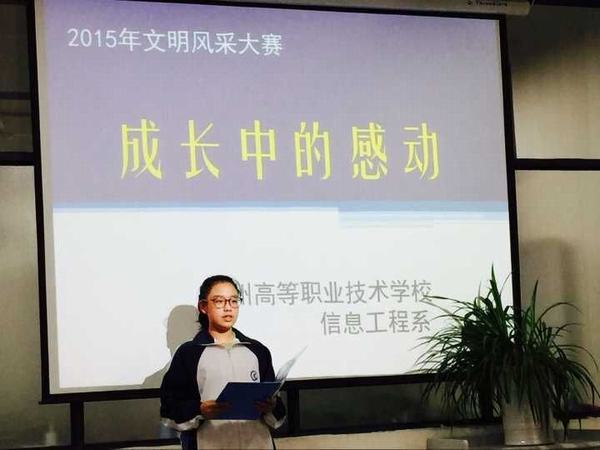此次比赛共有十八名选手参赛,以“牢记历史,爱我中华”和“成长中的感动”这两个主题进行演讲。赛前选手都做了充分的准备,当天下午,参赛选手们着校服,精神面貌饱满,激情四溢,配以精心准备的ppt演示文稿和背景音乐,整体效果良好。选手们富有激情、声情并茂的演讲获得台下观众的阵阵掌声。经过激烈的角逐之后,G13303班的周娜娜和G15304班的钱莹两位同学获得“牢记历史,爱我中华”主题演讲的一等奖,G15304班的韩文倩同学和G14304班的李秋虹两位同学获得“成长中的感动”主题演讲的一等奖。