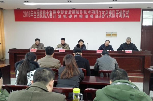 1月10日下午,2016年全国技能大赛中职组数字影音后期制作技术、计算机硬件检测项目江苏代表队赛前集训开营仪式在我校行政楼五楼会议室隆重举行。江苏省职业学校技能大赛办公室主任、省职教学会副秘书长张铎,江苏省技能大赛信息技术类总裁判长吴访升,扬州市教育局职社处处长杜稼锋,我校校长陈大斌、各集训选手以及所在学校的领导、集训教练参加仪式,仪式由纪委书记赵杰主持。