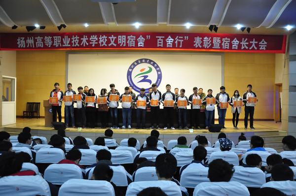 会上,表彰了2015-2016学年第一学期被评为“文明宿舍”和“优秀宿管学生干部”的集体和个人,并为其颁发奖状和荣誉证书;文明宿舍长代表申胜男同学做表态发言;学工处宋桂俊老师总结了上学期文明宿舍创建活动、叠被子比赛的开展情况,并对本学期创建活动提出要求。