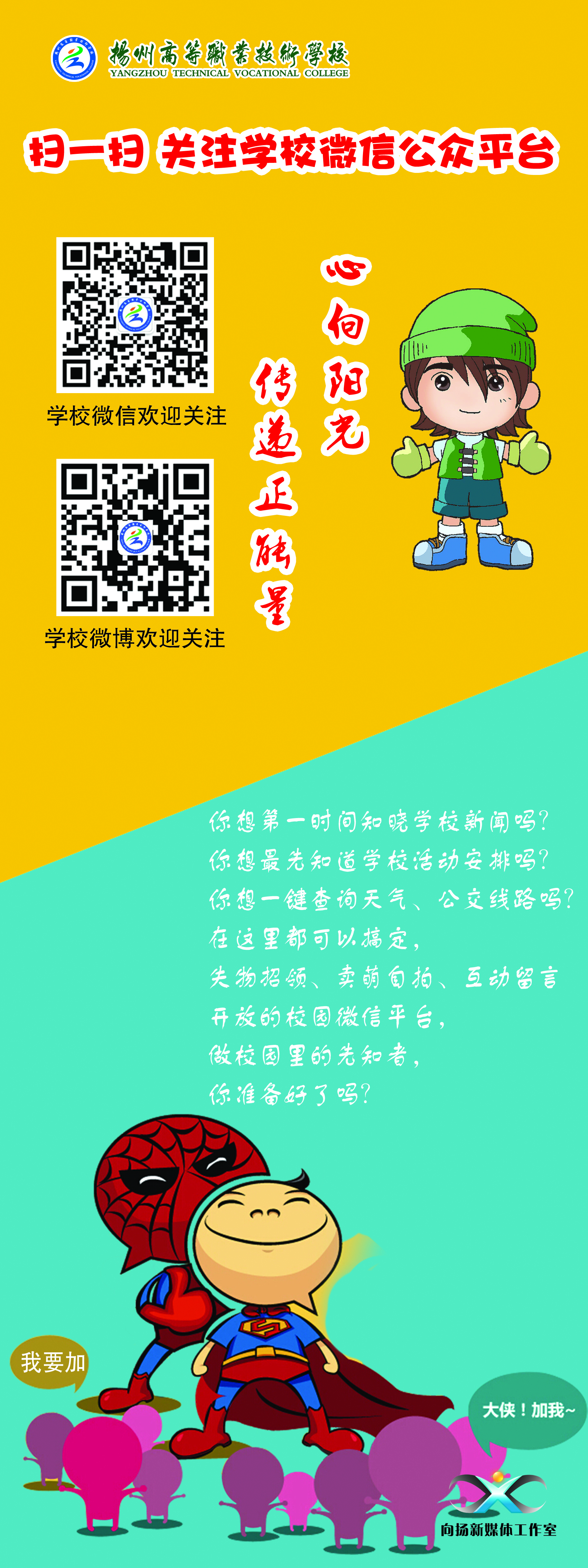 关注扬州市教育局和学校官方微信,请扫描下方二维码。