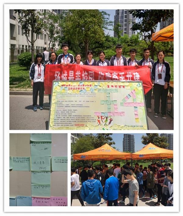 中午时分,活动现场已经人头攒动,准备工作紧张而有序地进行,校学生会在现场摆放了签名横幅和青春许愿板。活动正式开始,校学生会积极向大家宣传此次的意义与宗旨,使其了解作为学校的一份子所肩负的责任。参与者络绎不绝,纷纷执起手中的笔,认真而庄重地在红色横幅上签下了自己的名字,在青春许愿板上留下自己对校园的美好祝福,写下对五四运动的纪念和对自己青春的宣誓。