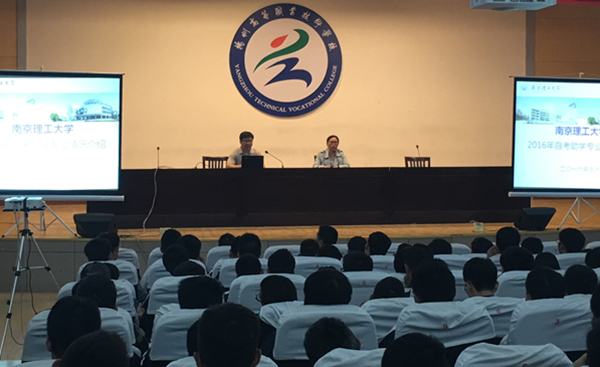 为满足我校五年一贯制高职学生追求更高学历层次的愿望,5月26日下午,学校在五台山校区报告厅举办了南京理工大学自考助学专题讲座。讲座邀请了南京理工大学继续教育学院自考科史烔煜科长担任主讲,2014级全体高职学生、相关班主任等聆听讲座。