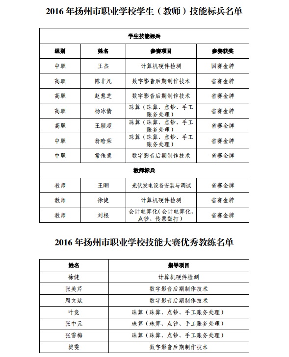 10月17日,扬州市教育局发布《关于公布2016年全市职业学校技能大赛先进单位和先进个人的通知》,我校被评为“2016年扬州市职业学校技能大赛达标单位及先进学校”;王杰、陈非凡、赵慧芝、杨冰倩、王颖超、翁晗荣、常佳慧七位学生被评为市职业学校学生(教师)技能标兵;王晅、徐健、刘根三位教师被评为市职业学校教师技能标兵。