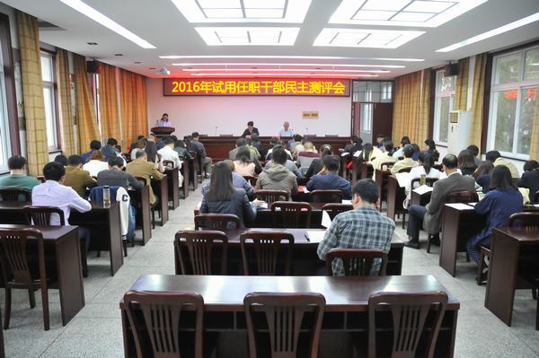根据市委组织部和市教育局党委统一部署,10月19日下午,学校在行政楼五楼会议室举行2016年干部试用任职民主测评会。会议由校党委书记周应华同志主持,校党政领导班子成员、学校中层以上干部及教研室主任参加会议。