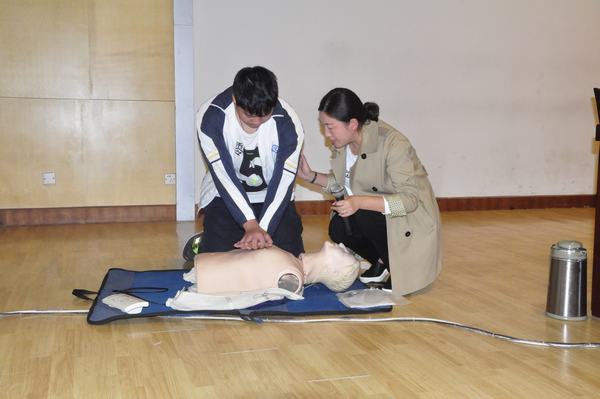 讲座伊始,施婷以PPT展示了校园意外事故的类型、近几年校园意外事故的统计数据、典型案例,普及基本的校园意外事故的急救知识;接着,她强调了CPR(心肺复苏)的重要性,列举了因为昏厥救治不当导致死亡的实例;随后,她就如何正确地进行胸外心脏按压进行讲解,突出了其中的五点要素和可能出现的六点错误和误区,特别提醒要关注急救中不可或缺的第二程序,即开放气道,并强调了七大要素。最后,她现场指导两名学生进行心肺复苏练习,取得了较好的效果。