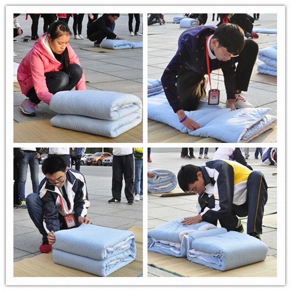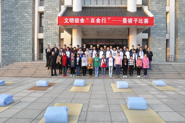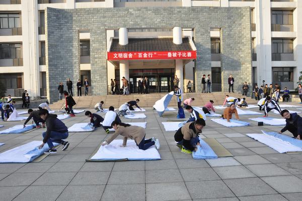 为更好地开展文明宿舍“百舍行”活动,进一步提高宿舍卫生、内务水平,活跃校园文化氛围,展示学生风采,11月2日下午,学工处宿管科组织2016级住宿生在学校实训楼前广场举行了一场形式正规、意义深远的叠被子比赛。