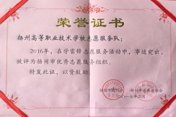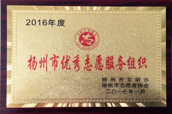 在扬州市文明办和志愿者协会开展的“2016年度扬州市志愿服务评优创先推荐活动”中传来喜讯,我校志愿者服务总队荣获“2016年度扬州市优秀志愿服务组织”称号。