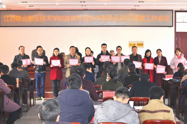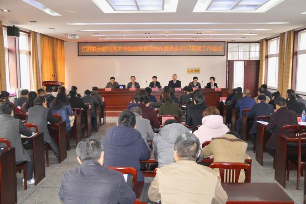 3月17日上午,江苏联合职业技术学院建筑专业协作委员会2017年度工作会议在我校隆重举行,联院副院长金友鹏、教学科研处处长程又鹏,理事长单位江苏城乡建设职业学院院长黄志良、协会秘书长戴敏秀、我校校长陈大斌出席会议,省内18家成员单位及办学点近80名代表出席会议,会议由学校纪委书记赵杰主持。