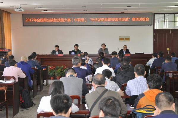 4月28日上午,2017年全国职业院校技能大赛(中职组)“光伏发电系统安装与调试”赛项说明会在学校顺利召开。全国电力教育教学委员会主任狄建雄教授、南京工程学院许其清教授、赛项企业代表南京康尼科技有限责任公司销售部副总经理邱明荣、学校纪委书记赵杰出席会议,来自全国各省市的40多个参赛院校的领导、指导老师近百人参加会议。