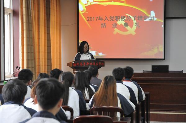 培训班班主任申惠芳老师对本期培训班的整体情况进行总结,自3月21日开始,本次培训班历时一个多月的时间,除了延续前几届培训班的开展形式,如:党知识专题讲座、观看爱国主义影片、分组讨论和写心得体会,本次培训班还邀请了校领导为学员们讲党课、组织学员赴史可法爱国主义教育基地和廉政文化教育基地校外参观学习。整个培训过程经过严格考核、闭卷考试和综合测评,54名学员全部顺利结业,8名学员被评为“优秀学员”。优秀学员代表——建筑与环境工程系的蔡露洁作学习心得发言,她回顾了在培训班中的学习经历,对她影响最深的是陈校长在党课中讲述的小故事,通过故事她意识到做人的道理,加深了对神圣的党组织的认识,坚定了自己忠于党组织加入党组织的坚定信念。