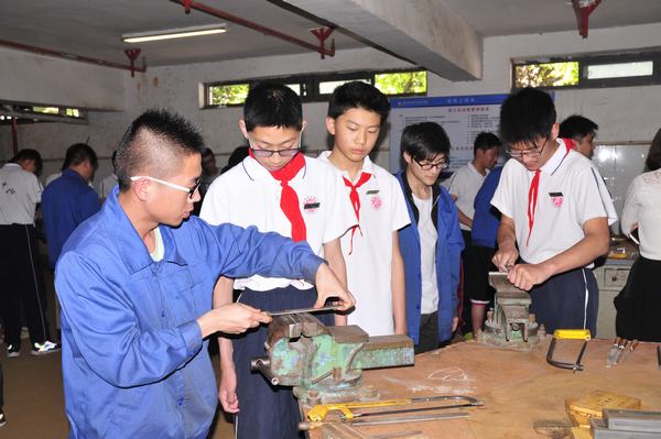 机电工程系引导学生在实训场所参观,重点观摩数控车、数控铣/加工中心、电火花/线切割加工,以及机电一体化生产线装调运行等,并进行专业讲解。在“我是小钳工”专业实践体验环节,学生们了解钳工在生产、生活中的重要性和钳工的历史传承等。除此之外,该系还安排了6位参加技能大赛训练的学生进行技能展示,文津中学的学生自己动手进行“锉”工艺加工,随后由指导教师进行“钻”孔加工,并倒角,最后,每个学生在课程结束时都将自己加工的小工件作为纪念品带回家。