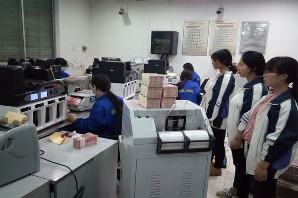 该银行点钞中心接受来自几十个营业网点的现钞清点处理与保管,每天通过机器与手工点钞的现金少则一、两千万,多则超亿元。我校经贸旅游系财会技能集训队师生在现场亲眼目睹了该银行点钞中心工作人员紧张忙碌、快捷到位、精准无误的操作过程,学生们的视觉、听觉乃至心灵都受到了极大震撼。现场观摩结束后,该部门经理与师生进行了交流与互动。她从专业的角度介绍了点钞岗位的职业道德、职业技能等方面的要求与规范,表示目前我校在该行工作的毕业生表现良好,进入招聘季以来,陆续有我校学生前来应聘,欢迎我校更多的优秀学生加入她们的团队。