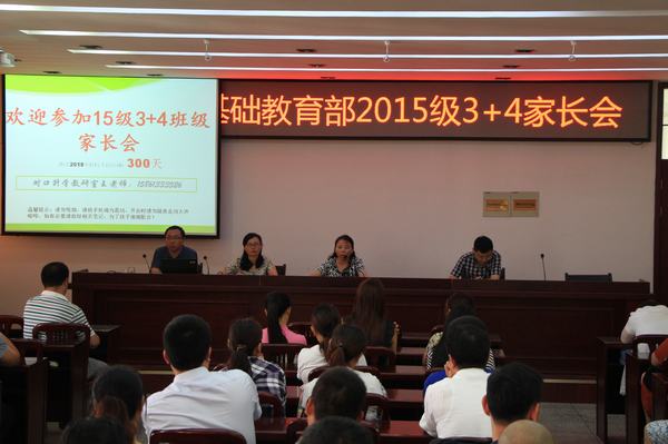 为了进一步加强学校与家庭之间的密切联系,帮助家长更全面地了解“3+4”教学工作和孩子在校的学习情况,真正达到家校携手共同培养孩子的目的,6月23日下午,基础教育部在行政楼五楼会议室召开2015级“3+4”班级家长交流会。基础教育部党支部书记、主任徐艳、副主任贾建伟、柏小凤、对口升学教研室主任王二兵和2015级“3+4”班级75名学生家长代表参加了会议,会议由徐艳主持。
