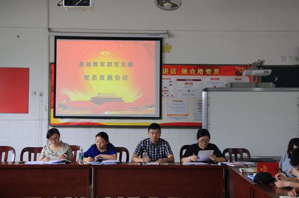 6月26日下午,基础教育部支部召开支部会议,该部全体正式党员和预备党员参加会议,讨论佘剑波、金之辉两位同志预备党员转为正式党员和入党积极分子邵静同志发展为预备党员的事宜,会议由该系副主任柏小凤主持。