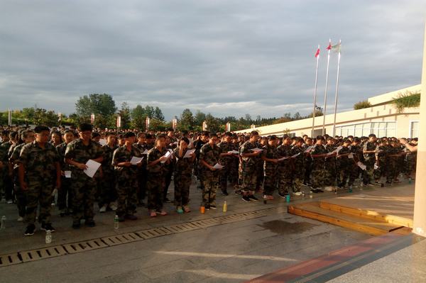 下午四点,全体高职校学子集合在主席台前,学工处副处长杨桂林对全体学生数日来的努力给予了充分肯定,同时也向所有学生提出了更高的要求。随后,经贸旅游系何葩老师教唱2017级新生校歌,很快学生就掌握了校歌的旋律。快结束的傍晚,天边洒下一抹余晖,悠扬的女声和浑厚的男声回荡在军训基地的每一个角落。