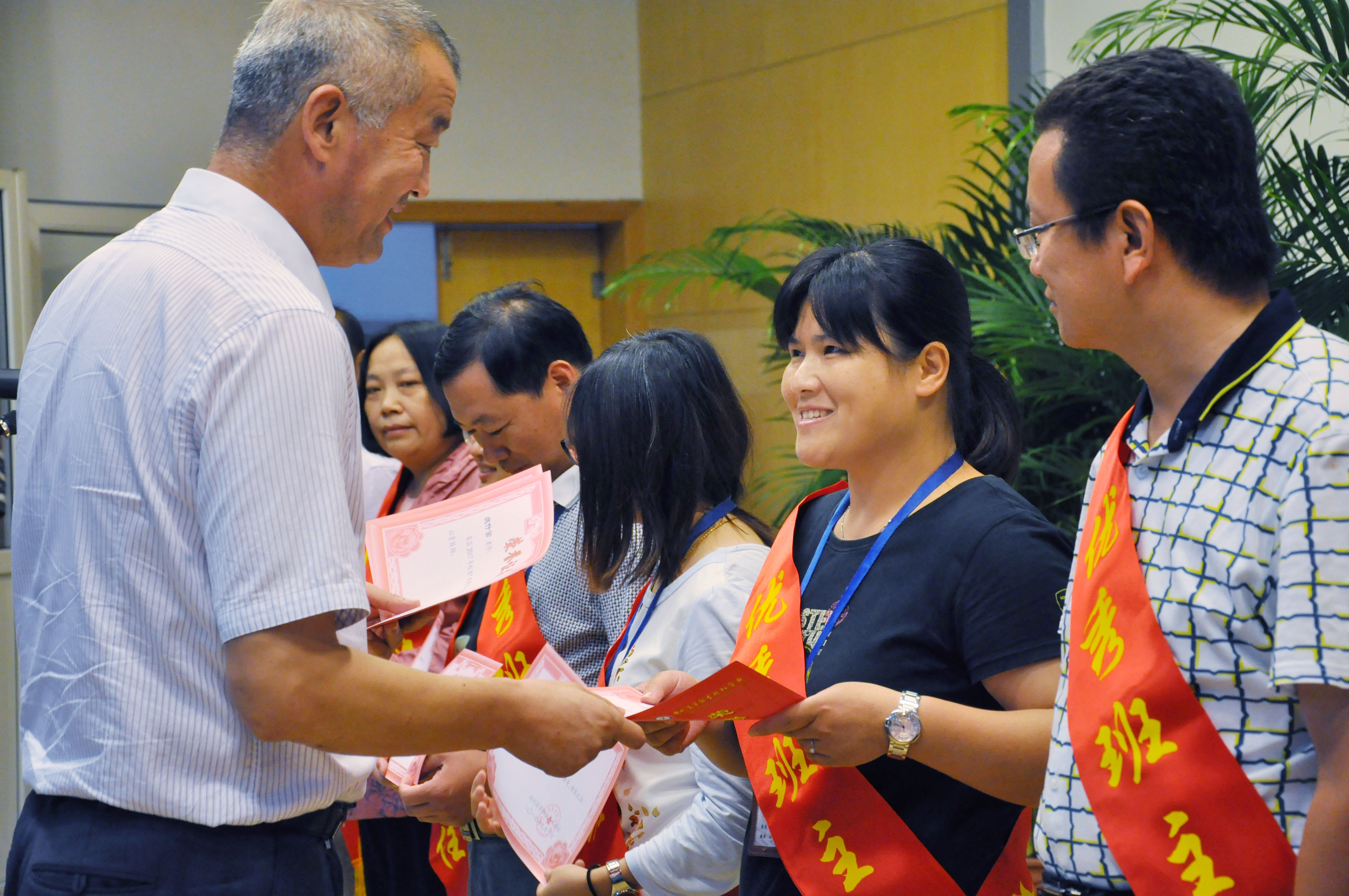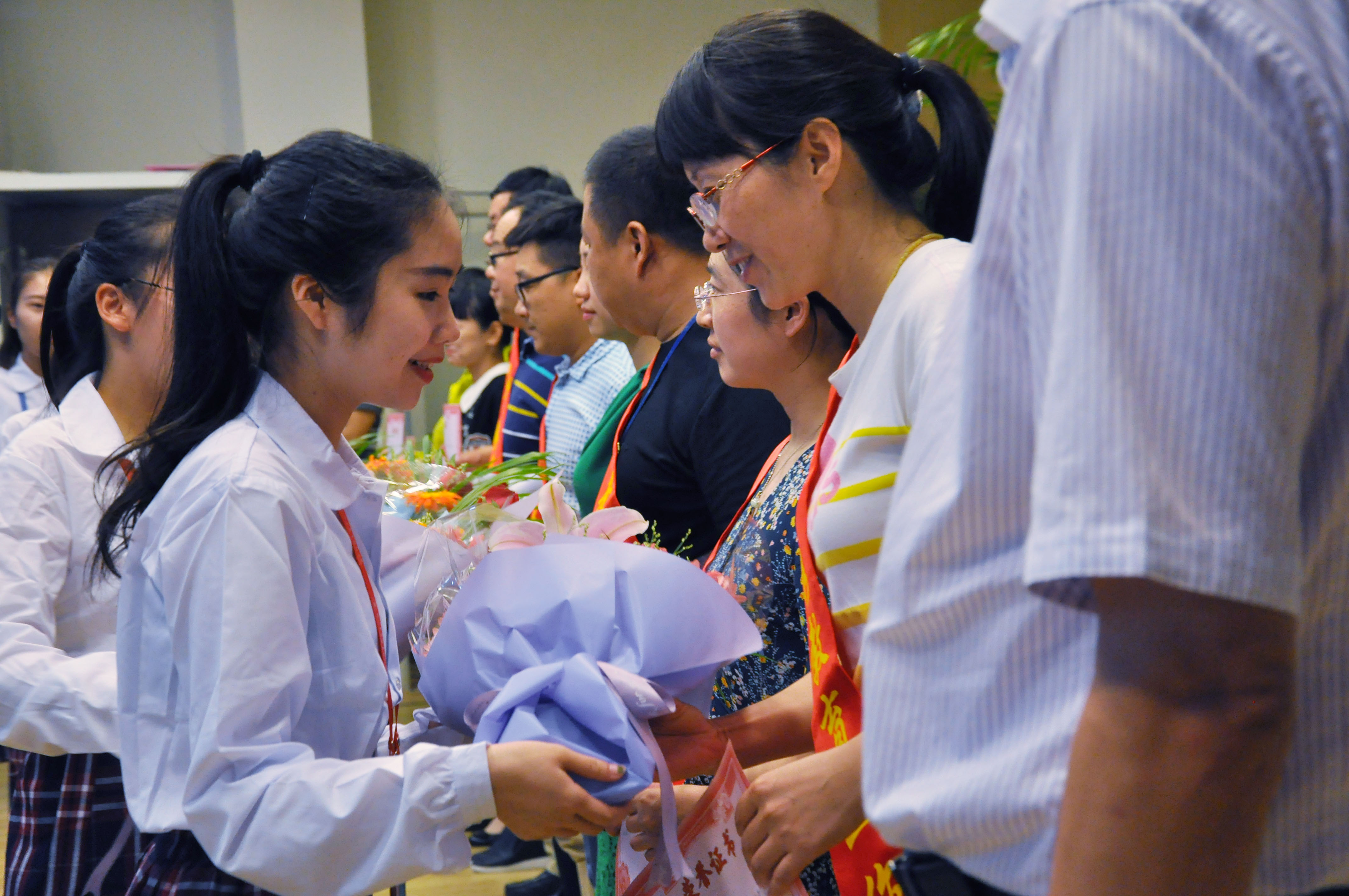 校领导为学校2017年校级优秀教师、优秀班主任、优秀教育工作者颁发荣誉证书,学生们向获奖教师献上了鲜花。