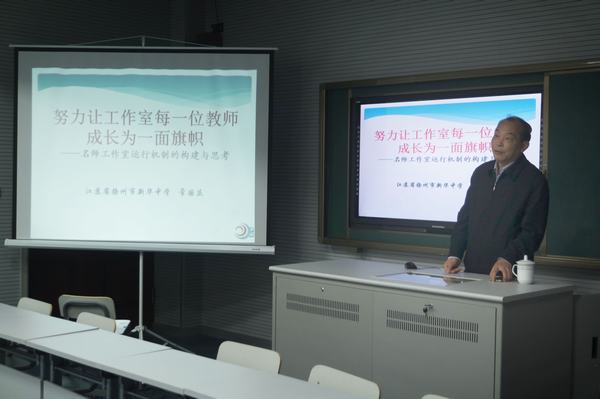 工作室特邀扬州市新华中学省特级教师常国庆教授作了《努力让工作室每一位教师成长为一面旗帜》的报告。常国庆教授从自己领衔扬州市中学数学名师工作室十多年来的经验谈起,分别就培植优秀教师、建设名师梯队,加强教育科研、打造学科特色,聚焦课堂教学、提高教学质量,开展主题活动、加强交流学习,组织支教活动、发挥辐射作用五个方面进行了深入的叙述,与会同志均感收益匪浅。