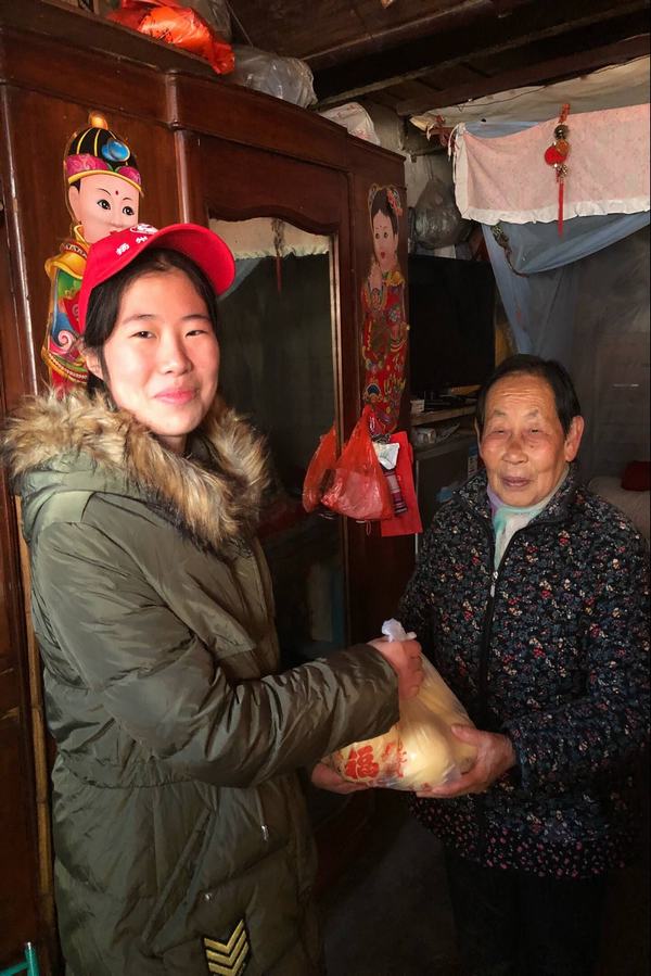 志愿者们提前准备了慰问品,看望住在社区里的孤寡老人们,希望能给寒冬里的孤寡老人们带来一些温暖。看到这群活泼青春的同学到来,老人们立刻兴奋起来,笑着,争相和志愿者交流。志愿者们也忙着发放慰问品,帮助打扫卫生,陪老人们聊天。虽然天气很冷,但没有人嫌脏,没有人说累,大家忙得热火朝天。