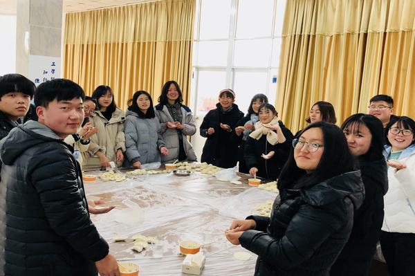 虽然活动是晚上进行,中午学生们就早早地来活动中心做准备,将饺子皮、馅料、清水、餐盘等材料摆放整齐。一些同学开始第一轮的包饺子,只见几十双上下翻飞的手中,饱满的饺子一个个成形。“馅料不要放太多,不然会露馅。”“侧边打出两个褶子,这样更好看。”“包的时候饺子皮边缘蘸点水可以加强粘合力”。“皮儿一定要捏紧了,免得一煮就破了!”这样的话语温暖了整个活动中心。