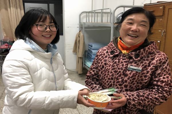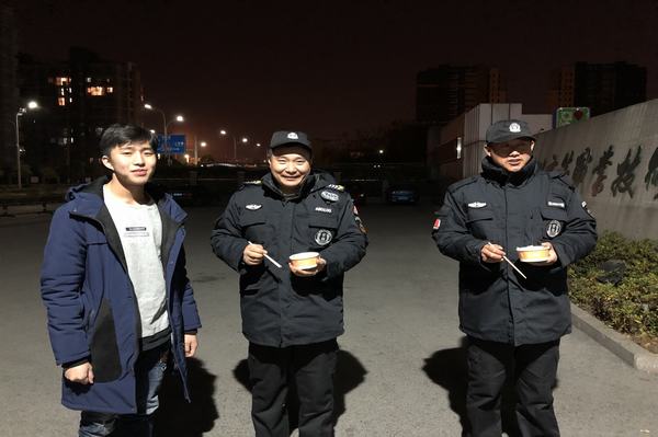 当晚,人员到齐后就开始下饺子,热气腾腾的饺子一出锅,各部门便分碗装好,分别将饺子送到学校宿管和门卫的手中。温馨的灯光下,热腾腾的饺子在寒冷的空气中散发着热气。宿管阿姨一直说:“真的太感谢了,感到很温暖。”正在门口执勤的门卫赶忙接过饺子,连着说了好几声“谢谢。”吃了一口饺子后,门卫不知该说什么,只顾着连声道谢:“饺子很好吃,谢谢你们!谢谢你们在寒冷中给我们送来温暖!也谢谢你们能够记得我们!”当晚,15位宿管员和门卫都收到了热气腾腾的饺子。
