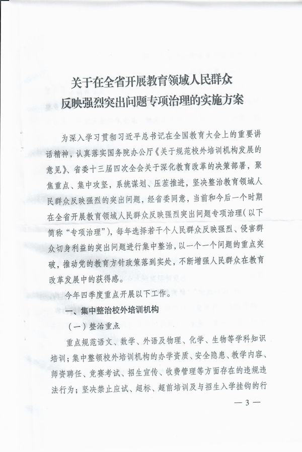 关于在全省开展教育领域人民群众反映强烈突出问题专项治理的实施方案