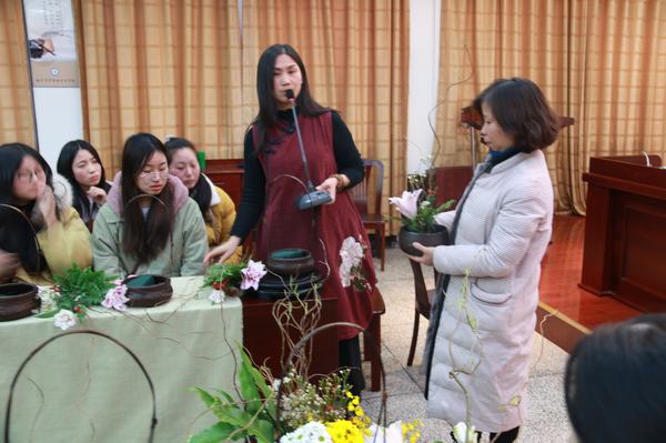 12月13日下午,受信息工程系的邀约,苏州幸福书院花艺导师妙云在学校道德讲堂为系百余名师生开设了“冬日暖阳,幸福一家”主题中式插花公益讲座。