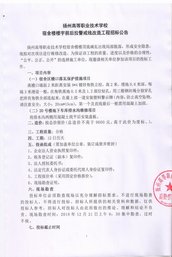 宿舍楼宇前后拉警戒线改造工程招标公告