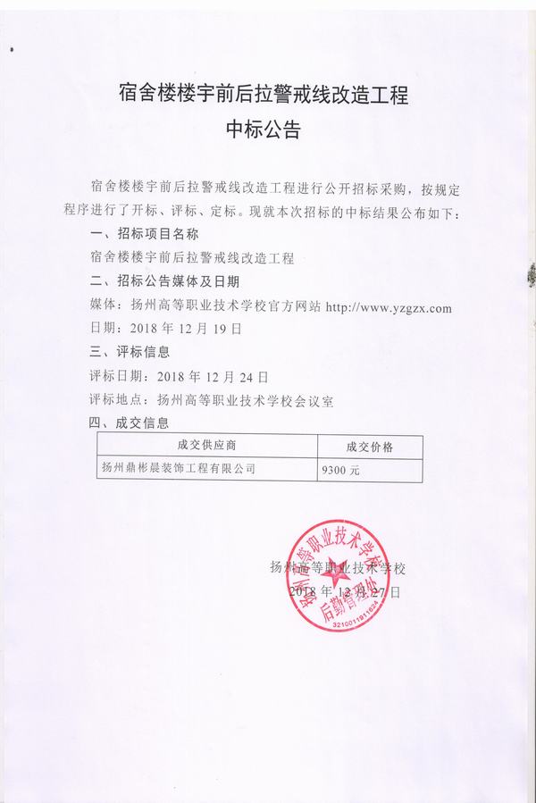 宿舍楼楼宇前后拉警戒线改造工程中标公告