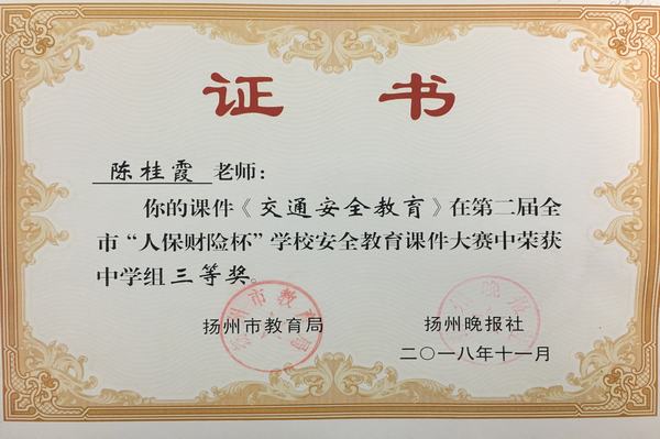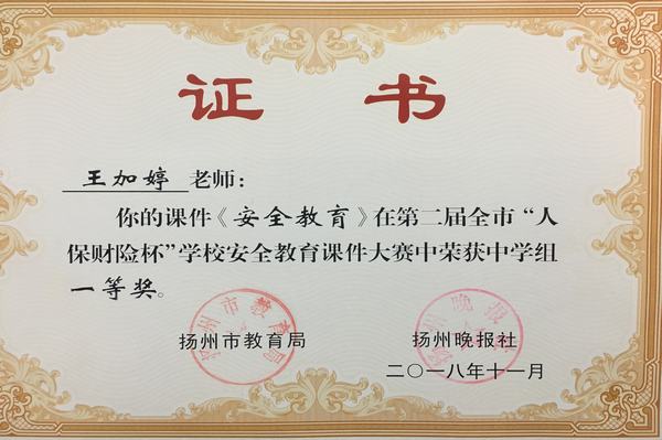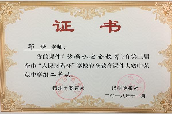 为扎实推进学校安全管理,切实增强学校安全教育的针对性和实效性,不断提高师生的安全意识与自我防护能力,有效防范各类事故发生。2018年6月扬州市教育局和扬州晚报社联合举办了“人保财险杯”第二届全市学校安全教育课件大赛。全市中小学教师和安全工作者参与了此次比赛。