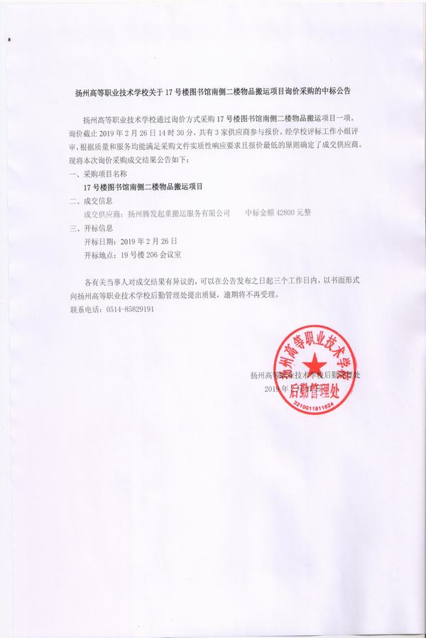 17号楼图书馆南侧二楼物品搬运中标公告