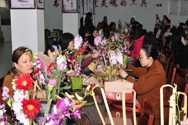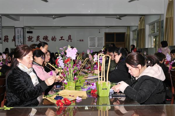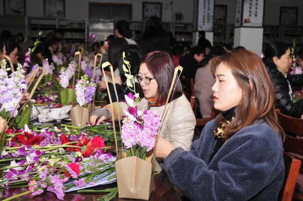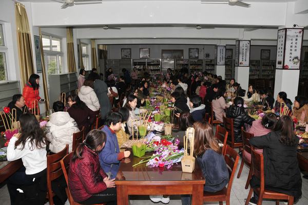 为丰富女职工文化生活,提高女教职工美学素养及审美能力,3月8日下午,学校以工会小组为单位,在图书馆阅览室举办艺术插花培训活动,近百位女职工参加活动,享受闲适与艺术,活动也吸引了一些男教职工前来。