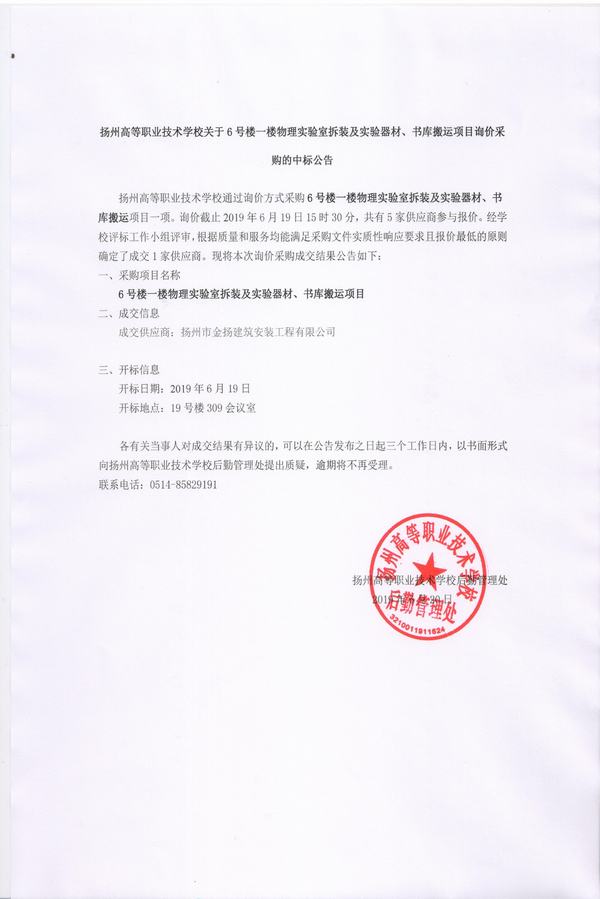 6号楼一楼物理实验室拆装及实验器材、书库搬运项目询价采购的中标公告