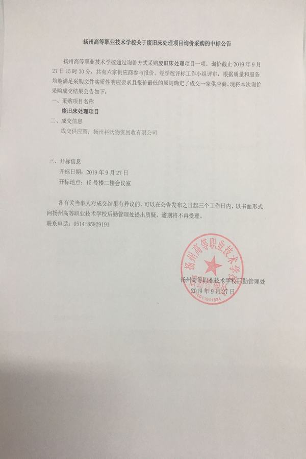 bat365官网登录关于废旧床处理项目询价采购的中标公告