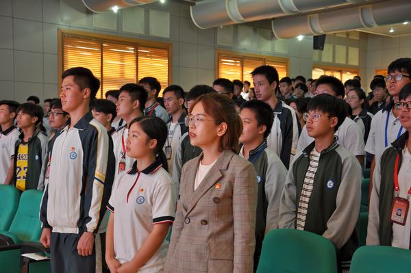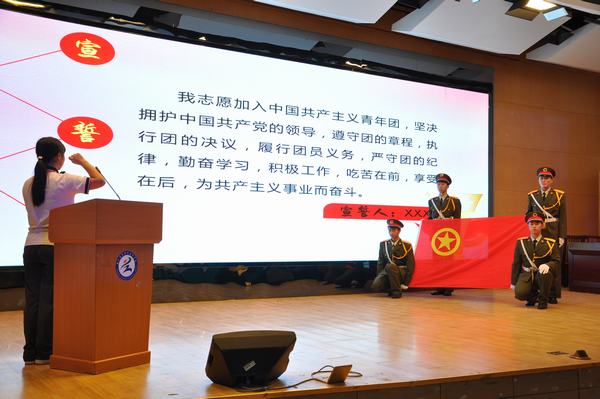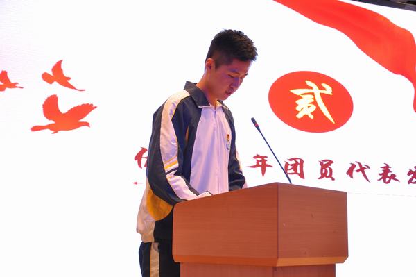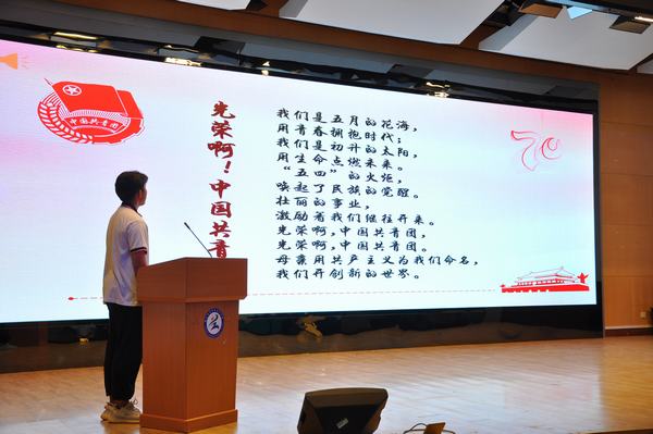 活动在振奋激昂的国歌声中拉开帷幕。团员代表周润扬进行了以“我与祖国共奋进”为主题的精彩演讲,教师代表张渊慕为团员代表讲授主题微团课,随后在团员代表左敏的带领下重温了入团誓词。
