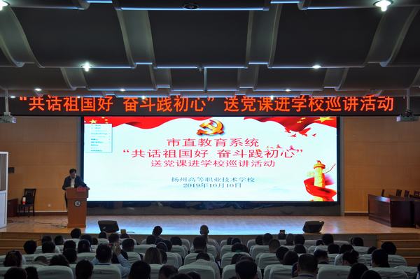 10月10日下午,扬州市教育局“共话祖国好 奋斗践初心”送党课进学校巡讲活动走进我校,党委副书记、纪委书记赵杰主持活动,全体党员在报告厅集中聆听了巡讲团三位党课主讲人带来的优秀党课。