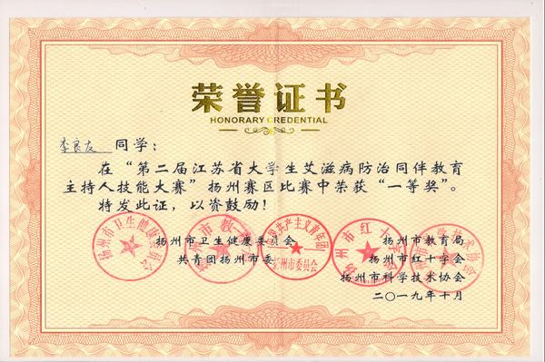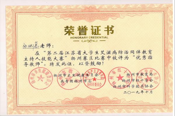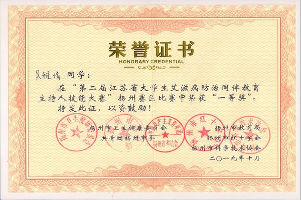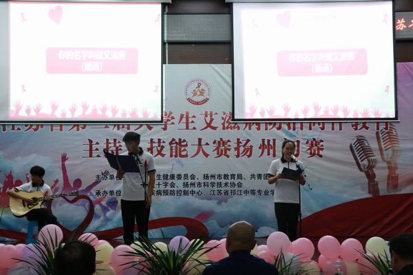 大赛由主题演讲、知识问答、才艺展示三个环节组成。在主题演讲环节,我校选手以《提高全民关注度让艾滋病人获得幸福》为题讲述如何在生活中对待艾滋病人、关爱艾滋病人;在知识竞答环节,选手们准备充分,对答如流,获得一致好评;才艺展示环节中一首艾滋病主题曲“瞳孔里的太阳”,结合诗歌朗诵及学校日常防艾工作进行汇报,新颖巧妙的表达使得在场评委和观众们眼前一亮,现场气氛热烈。经过激烈角逐,我校参赛团队表现优异,展示出了学子们朝气蓬勃的精神风貌,吴雅倩、李良友获得一等奖,张渊慕老师获评“优秀指导教师”,学校将代表扬州市参加省级比赛。(图文/张渊慕 审稿/王玮)