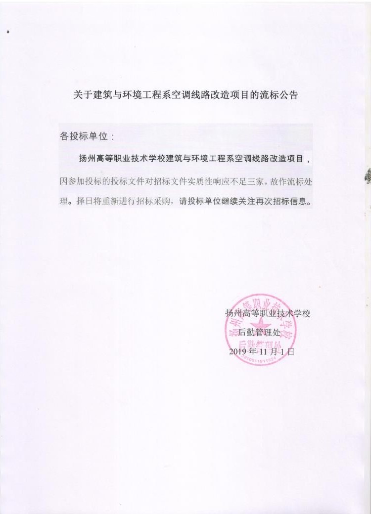 关于建筑与环境工程系空调线路改造项目的流标公告