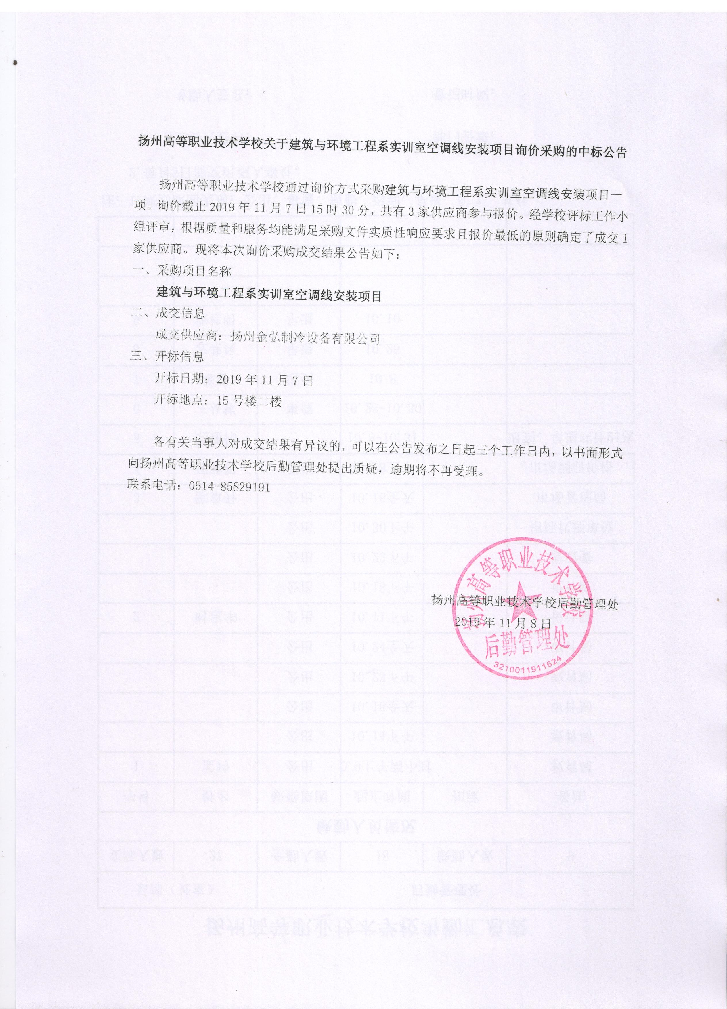 关于建筑与环境工程系实训室空调安装项目询价采购的中标公告