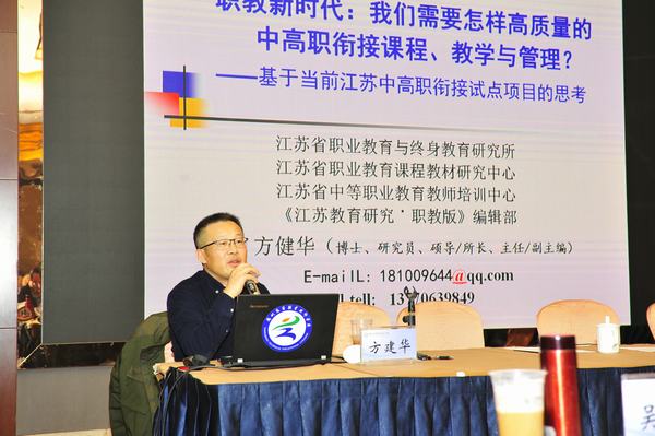 扬州市委教育工委书记、市教育局局长周应华首先致辞,向曹厅长及各位专家的到来表示了欢迎。江苏省教科院江苏省教育科学研究院职业教育与终身教育研究所所长方健华作了题为《职教新时代:我们怎样高质量的中高职衔接课程、教学和管理》专题报告,重点阐述了对当前江苏中高职衔接项目的思考。吴学敏总结了第四届省职业教育发展战略研究中心组工作并对后期工作提出建议。参会的高职院校领导就推进现代职教体系建设做表态发言。学校副校长强玉龙做了题为《海深方得百川聚花香自有蝶飞来》的主题发言,就学校产教融合、校企合作、构建完善校企协同育人机制等进行交流研讨。