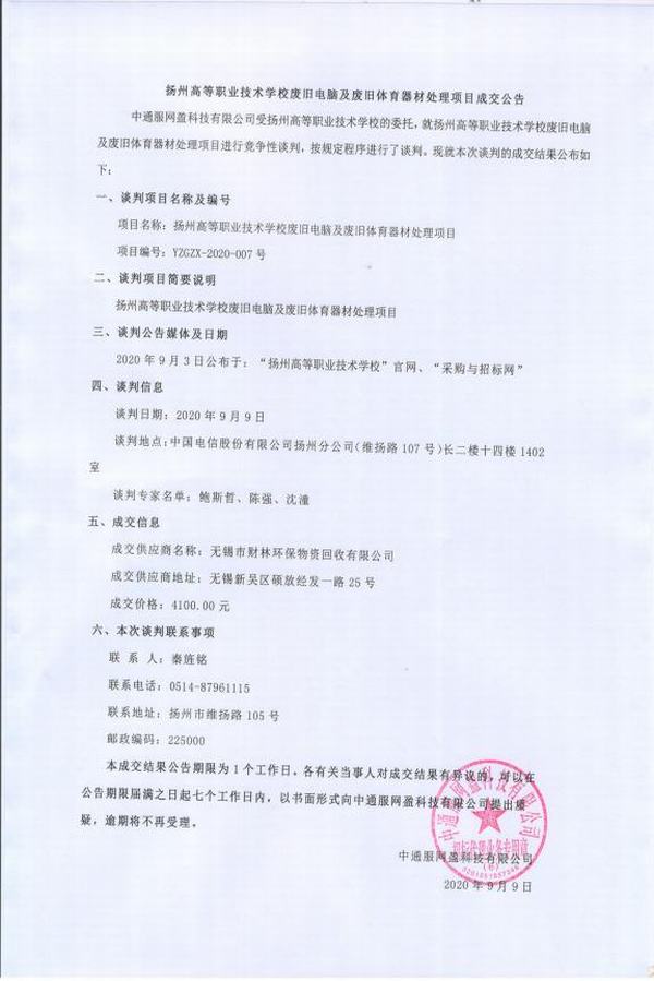 bat365官网登录废旧电脑及废旧体育器材处理项目成交公告