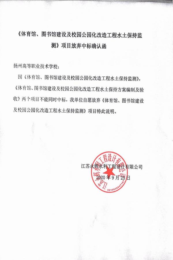 体育馆、图书馆建设及公园化改造工程水土保持监测项目放弃中标确认函
