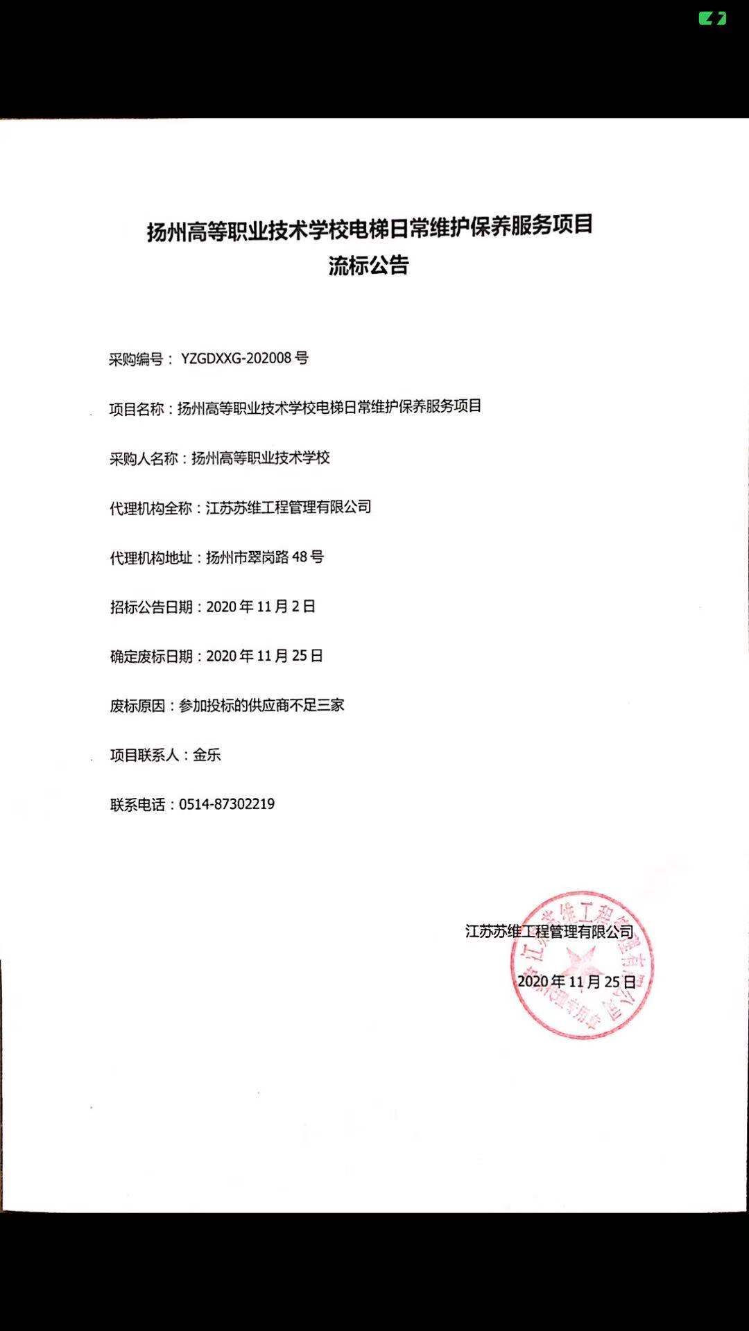 电梯日常维护保养服务项目流标公告