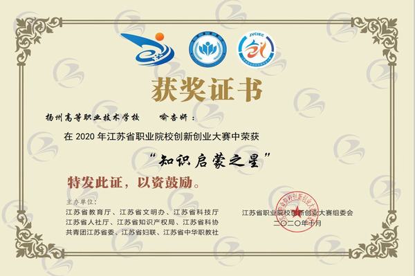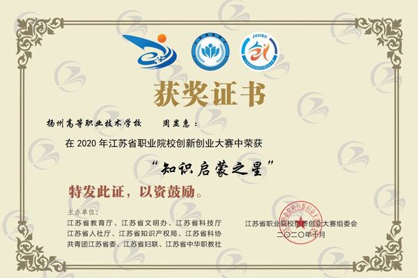 近日,2020年江苏省职业院校创新创业大赛传来喜报,经贸旅游系17402班周显惠、喻杏妍两名同学荣获“知识启蒙之星”称号。