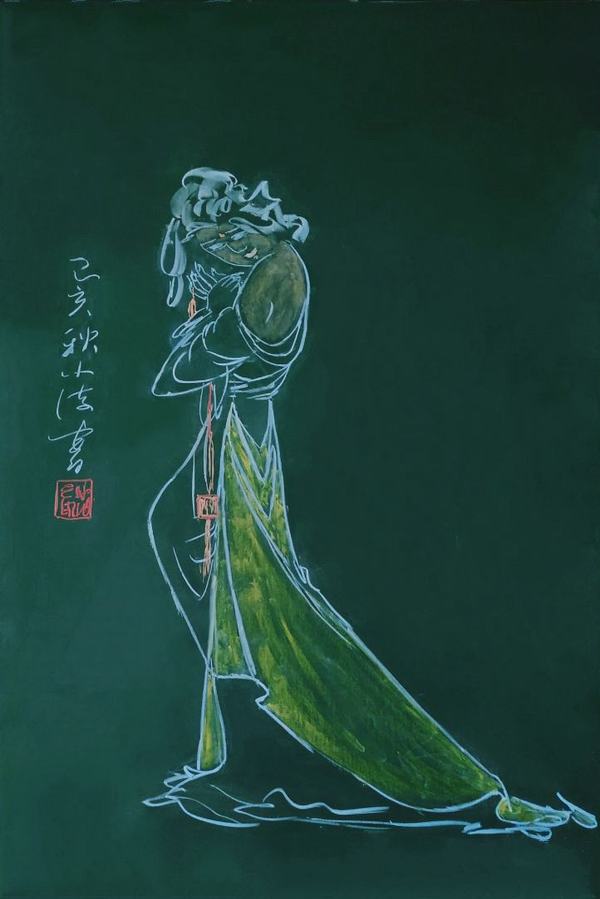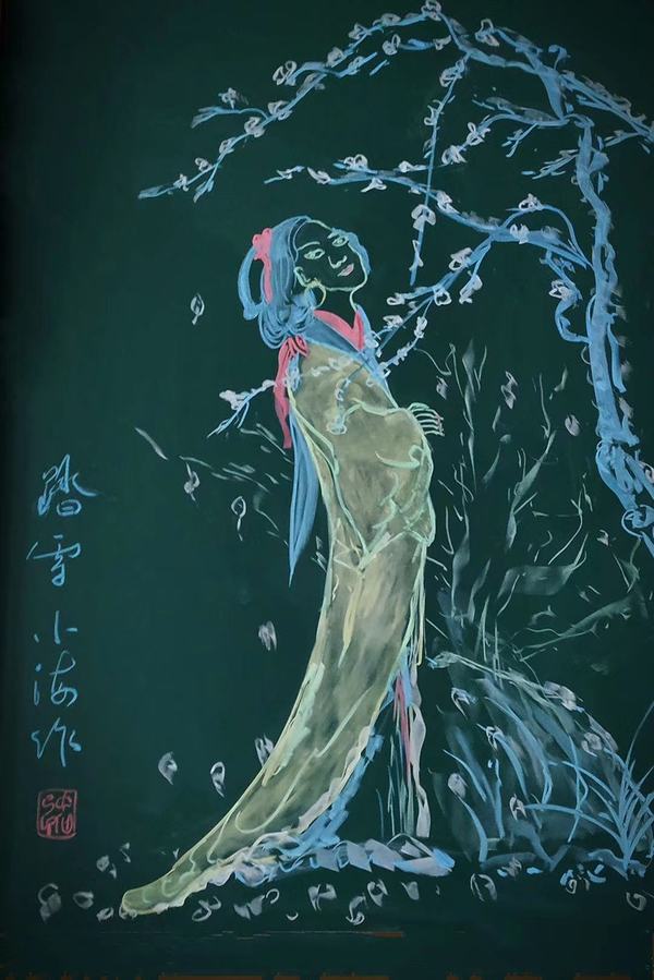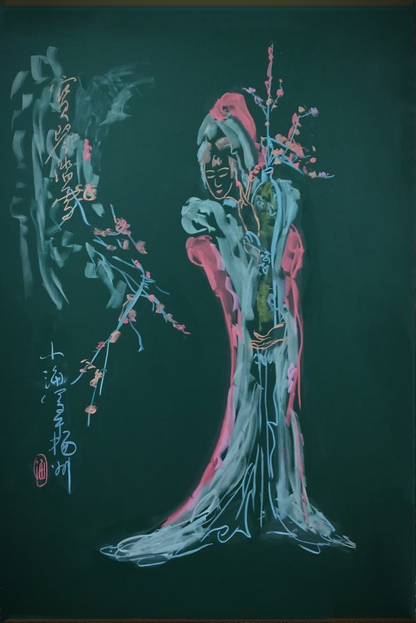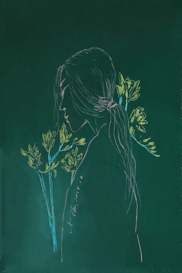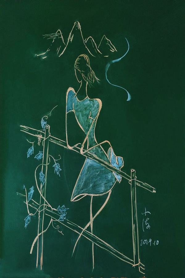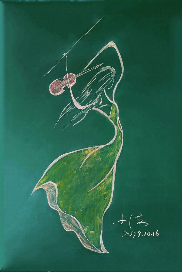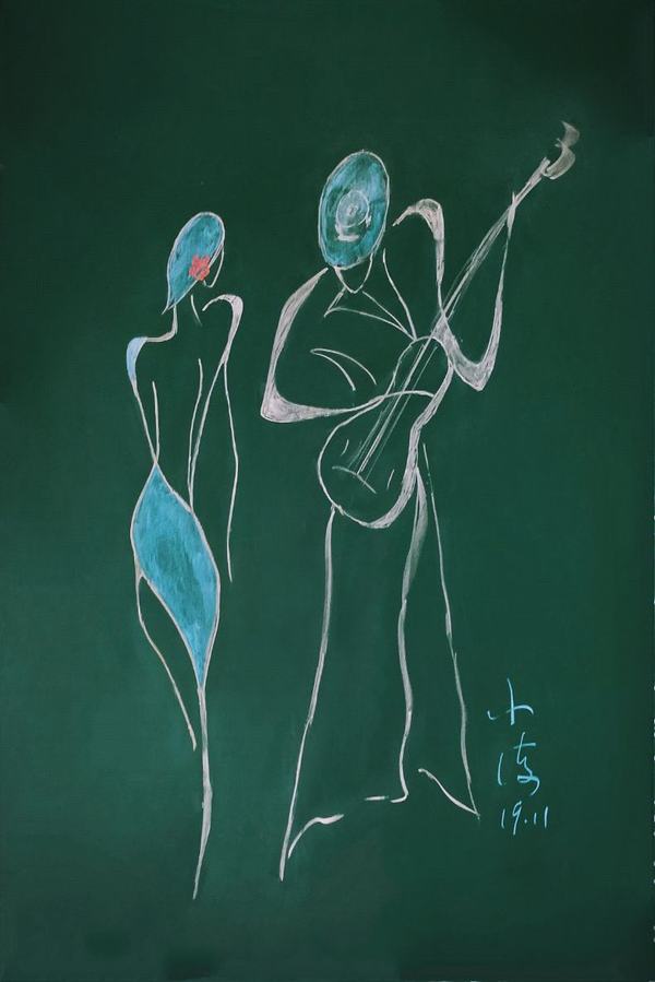 初见朱中海老师的作品,无非几笔柔和简洁的线条,或因作画工具的缘故,色彩表达亦相对有限。然而,从一个数学人的视阈出发,去重审这些粉笔画作品时,那些曲线和直线、角度和符号,立刻将我们引入一个生动的函数世界——枯燥的公式、复杂的推理和抽象的理论全都为飘逸的人物、大胆的用色、温馨的情感所消解。数学不再是令人头疼不已的考试科目,而作为生活的一部分沉淀到学生漫长的人生之中,其形式别具一格,其美感历久弥新。诚如朱中海老师本人所言,他的作品皆源于教学,得之自然,发自内心,这样融文、理、艺一体的教学模式于学生而言是一种感官和心灵的享受,于教育而言是一种极具先锋性的新方向。