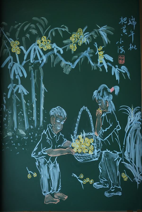 现场展出的《舞动的函数》《灵动的曲线》《服饰中的数学元素》《当美食邂逅数学》《国画中的点线面》等八个系列117幅粉笔画作品,题材各异,色彩缤纷,凭借贴近日常生活的形象、圆融流畅的线条和精巧诙谐的构思引起广大师生的高度关注和广泛好评,且被大家纷纷拍照收藏。同学们说:“朱老师是数学老师中语文最好的、语言表达最棒的,画画最好的,他的粉笔是天下最柔软的。”青年教师们说:“朱老师的心比他的画更萌,他是我们的偶像。黑板虽小,天地却大,他静守一方,便足以屏蔽一切的躁动与喧嚣,沉浸在自己对教学的执着探究中。”