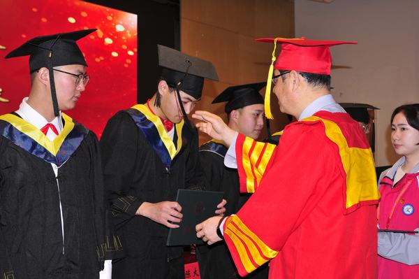 随后,张振伟、陈大斌两位学术导师逐一为167名获得学士学位的学子正冠拨穗,颁授证书,并合影留念。