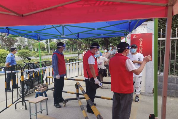 8月5日清晨,机电工程系党支部书记栾玉祥、副书记闵立中、纪检委员夏云、统战委员赵亮以及工会小组长赵云枫五名党员教师早早来到疫情防控点,他们身着志愿服务外套,正确佩戴防护罩、口罩等防护用品,积极认真热情地投入到志愿服务工作中去,仔细进行测体温、查苏康码、核验身份证件、维持秩序等操作程序。责任和担当让胸前的党徽在炽热的阳光下熠熠生辉,汗水伴随着被风吹动的党旗尽情挥洒。