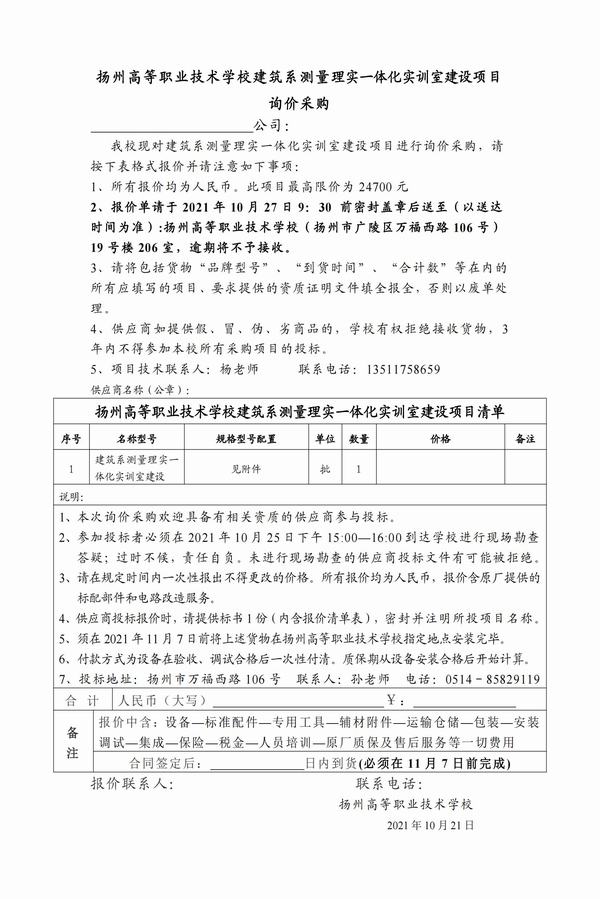bat365官网登录建筑系测量理实一体化实训室建设项目询价采购公告